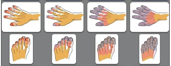 △图源:浙大一院全科医疗科 从左到右分别是I度冻伤、II度冻伤、Ⅲ度冻伤、IV度冻伤